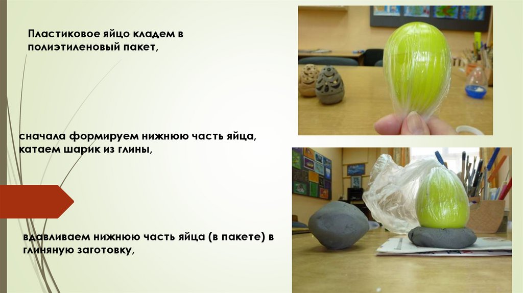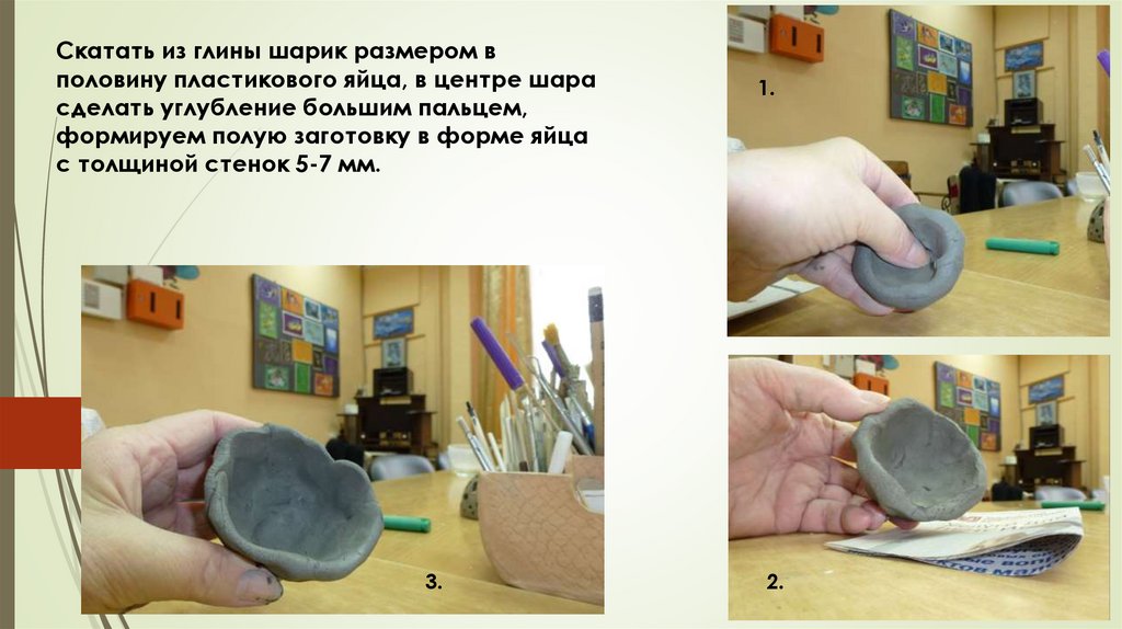 Скатать из глины шарик размером вполовину пластикового яйца, в центре шара