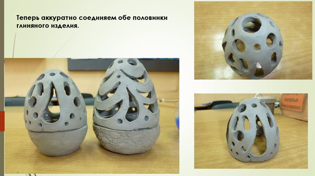 Теперь аккуратно соединяем обе половинкиглиняного изделия.