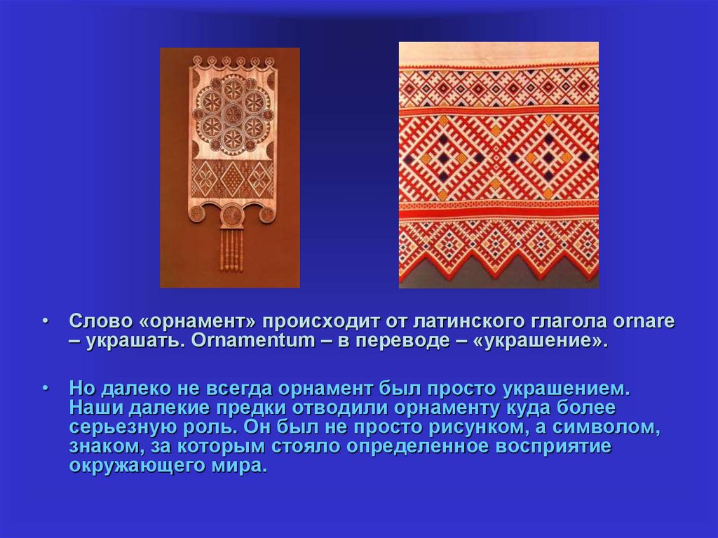 • Слово «орнамент» происходит от латинского глагола ornare– украшать. Ornamentum – в переводе – «украшение».