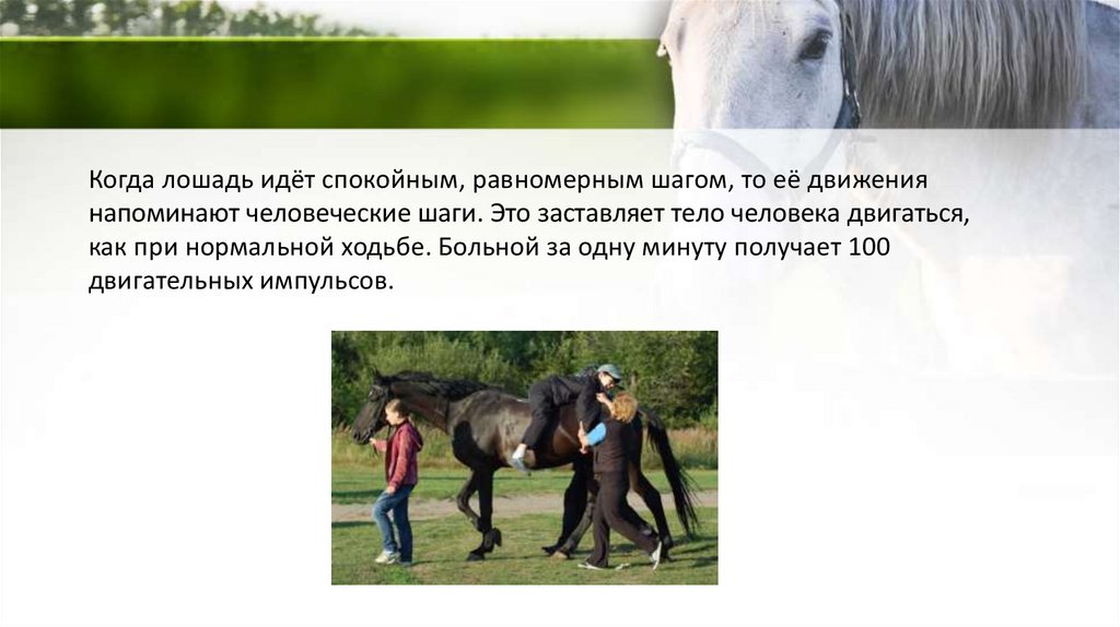 Когда лошадь идёт спокойным, равномерным шагом, то её движениянапоминают человеческие шаги. Это заставляет тело человека двигаться,