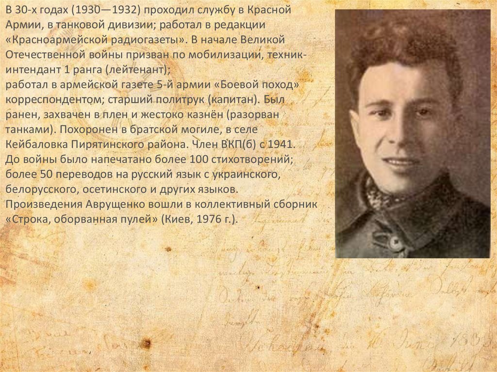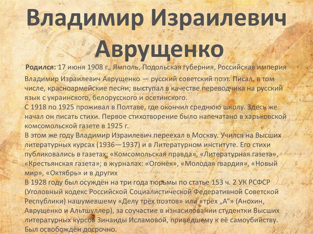 Владимир Израилевич Аврущенко — русский советский поэт. Писал, в том