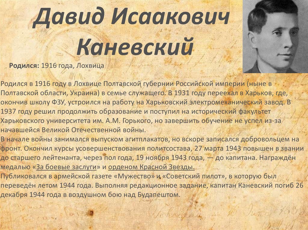 переведён летом 1944 года. Выполняя редакционное задание, капитан Каневский погиб 26