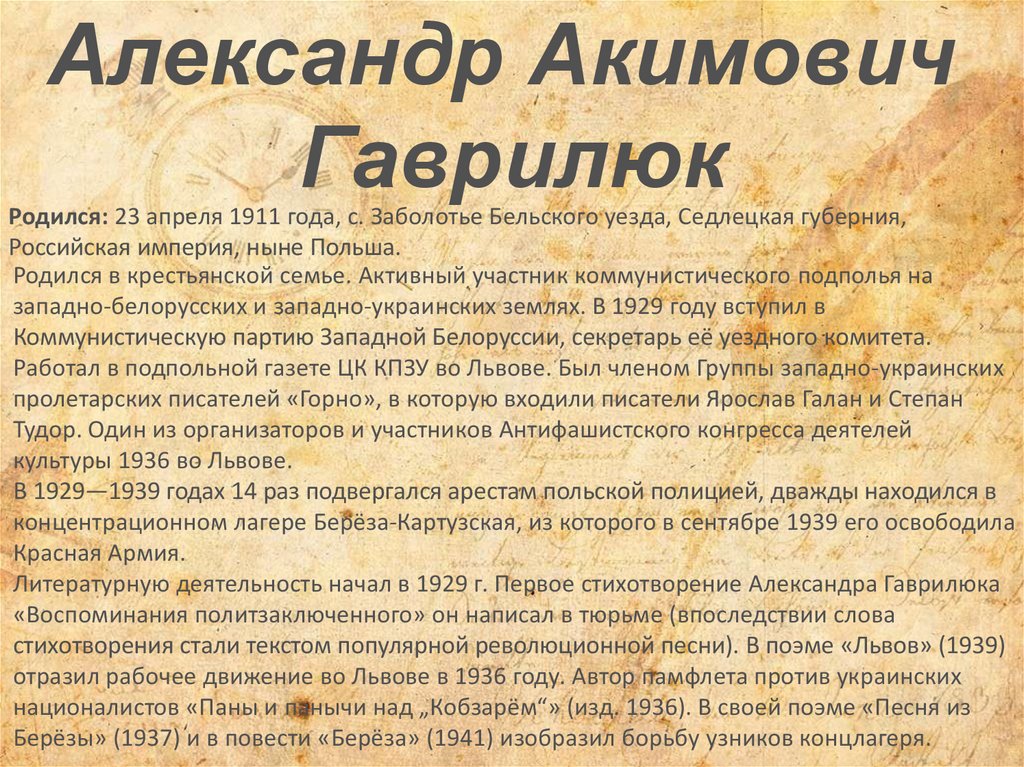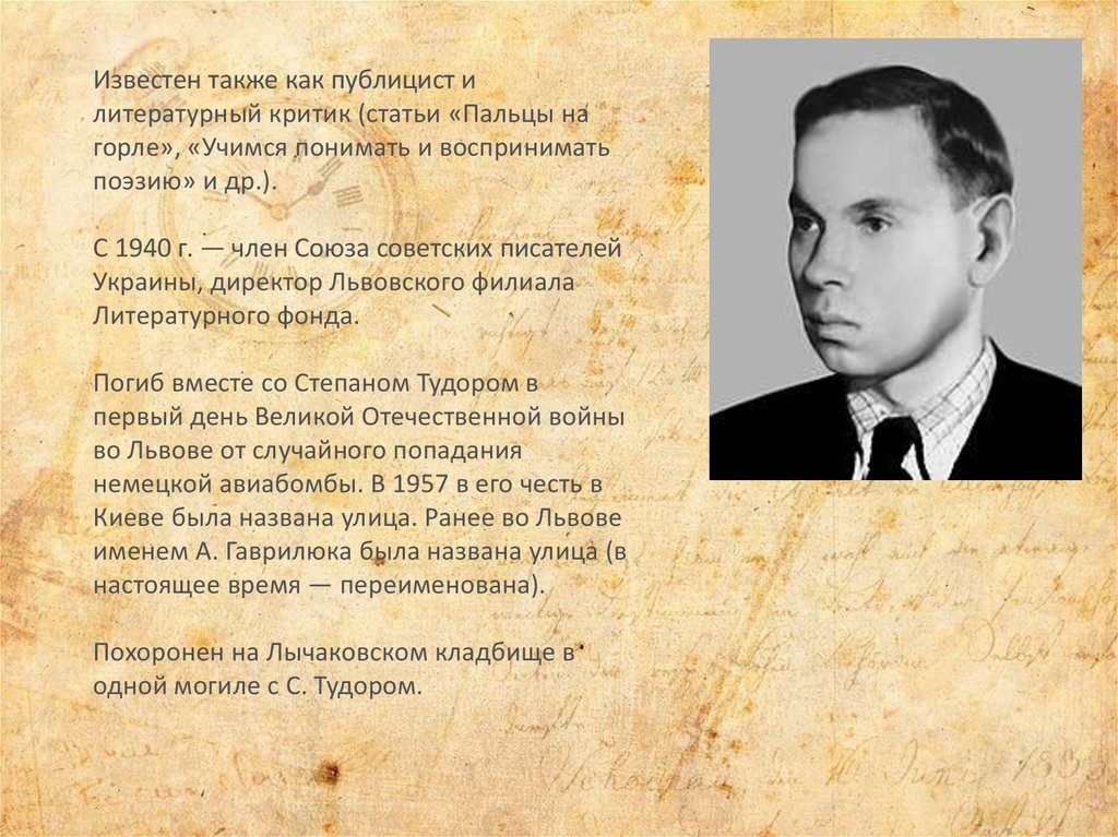 Литературную деятельность начал в 1929 г. Первое стихотворение Александра Гаврилюка