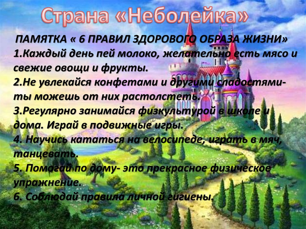 ПАМЯТКА « 6 ПРАВИЛ ЗДОРОВОГО ОБРАЗА ЖИЗНИ»1.Каждый день пей молоко, желательно есть мясо и