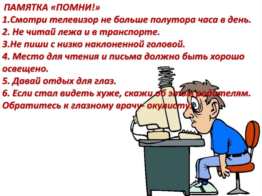ПАМЯТКА «ПОМНИ!»1.Смотри телевизор не больше полутора часа в день.