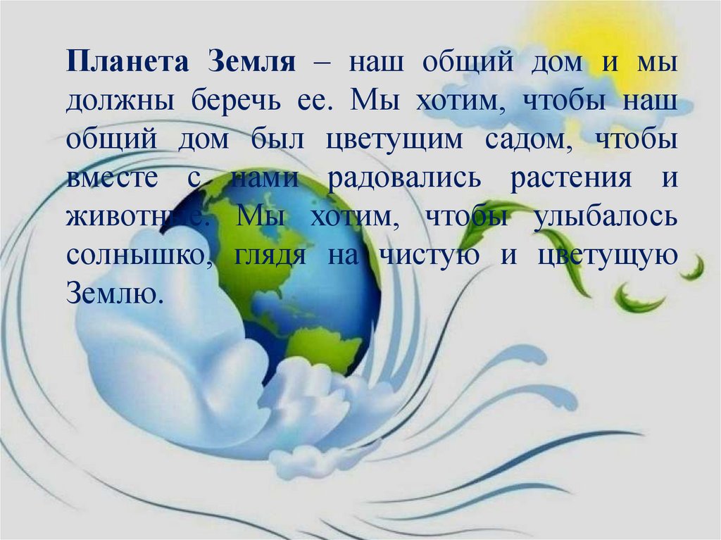 Планета Земля – наш общий дом и мыдолжны беречь ее. Мы хотим, чтобы наш