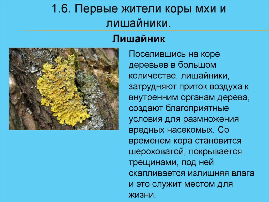 1.6. Первые жители коры мхи илишайники.