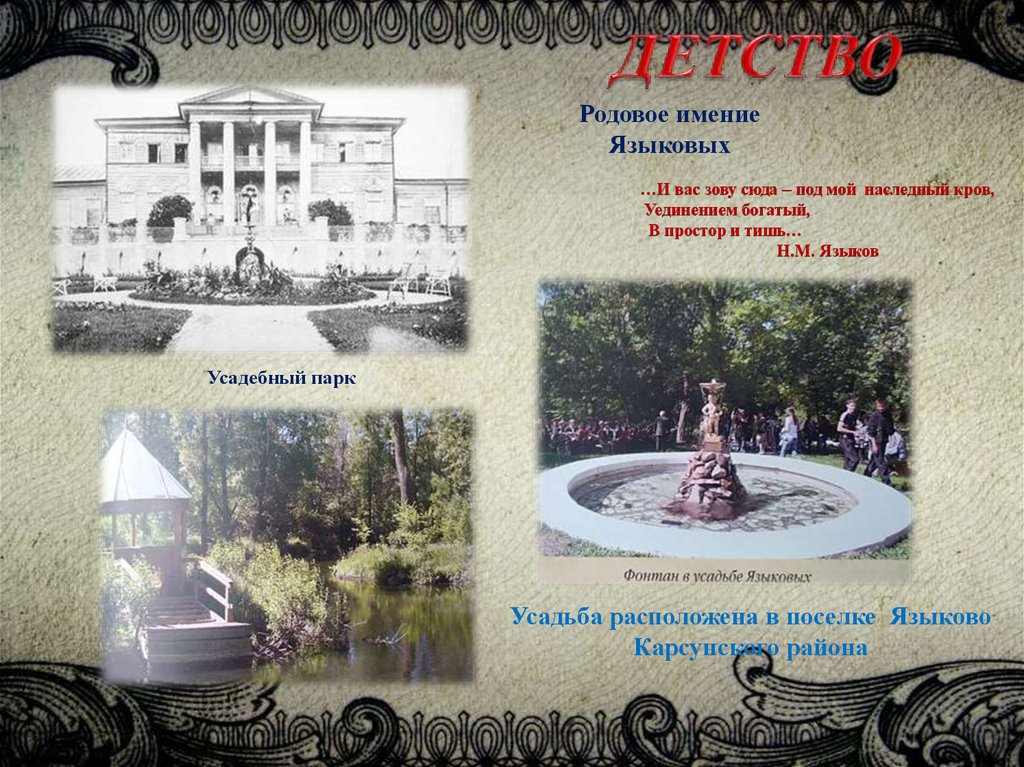 Фотографии парка и фонтана усадьбы –https://whathere.ru/4034-muzejnyj-kompleks-usadbayazykovyh-obl-ulyanovskayar-n-karsunskijrp-yazykovoul-pushkinad-13a/