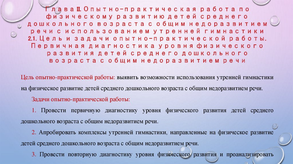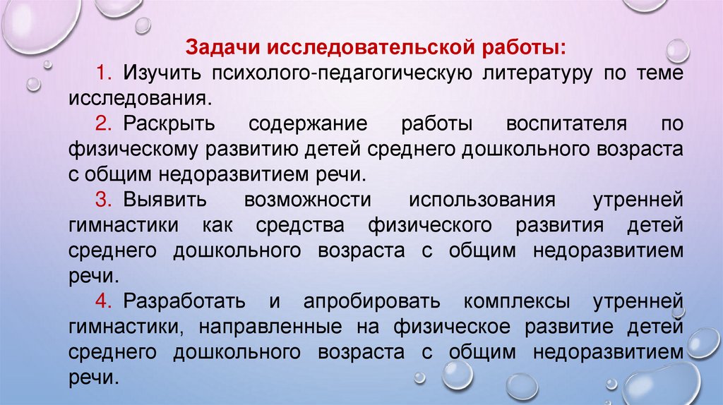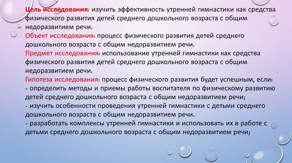 Цель исследования: изучить эффективность утренней гимнастики как средствафизического развития детей среднего дошкольного возраста с общим