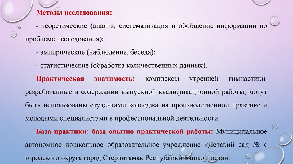 Методы исследования:- теоретические (анализ, систематизация и обобщение информации по