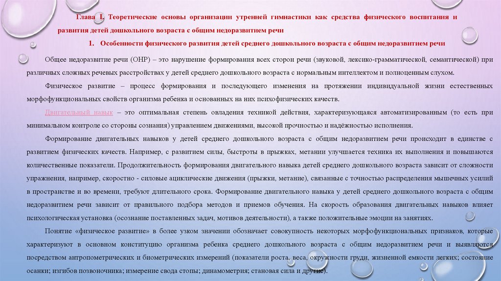 Глава I. Теоретические основы организации утренней гимнастики как средства физического воспитания иразвития детей дошкольного возраста с общим недоразвитием речи