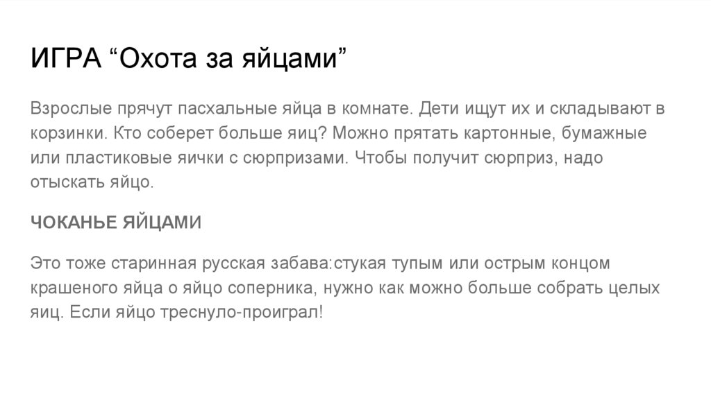 ИГРА “Охота за яйцами”Взрослые прячут пасхальные яйца в комнате. Дети ищут их и складывают в