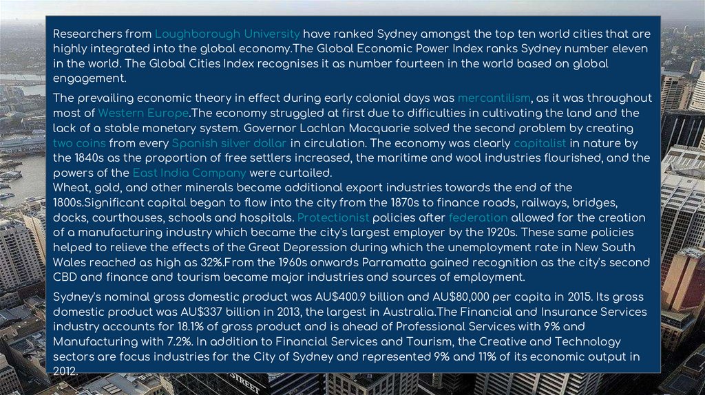 Researchers from Loughborough University have ranked Sydney amongst the top ten world cities that arehighly integrated into the global economy.The Global Economic Power Index ranks Sydney number eleven