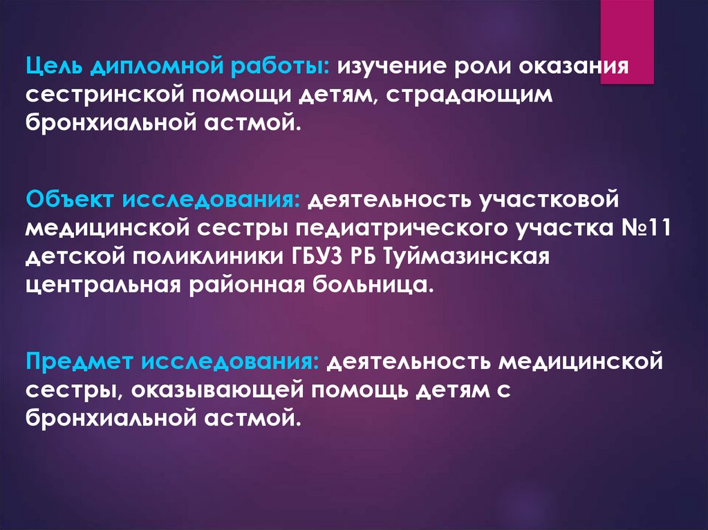 Цель дипломной работы: изучение роли оказаниясестринской помощи детям, страдающим