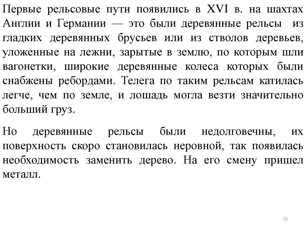 Первые рельсовые пути появились в XVI в. на шахтахАнглии и Германии — это были деревянные рельсы из