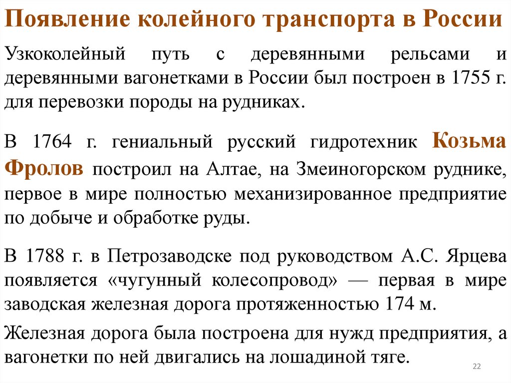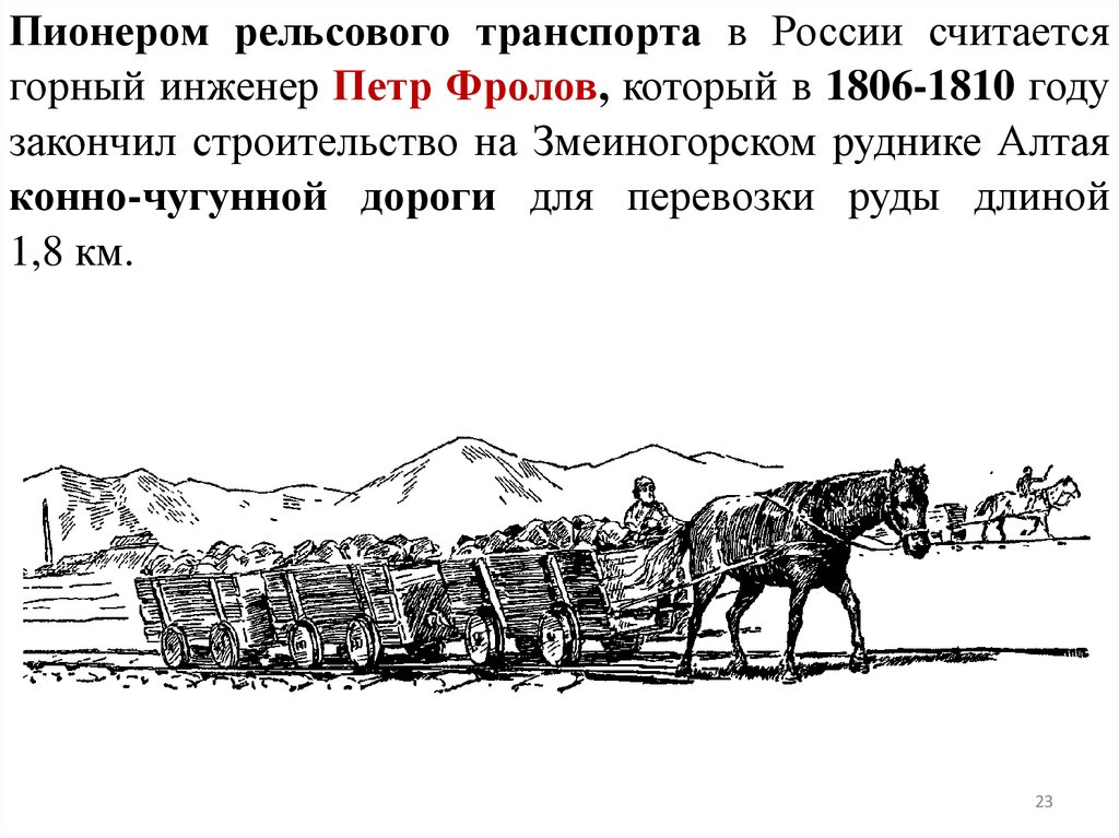 Пионером рельсового транспорта в России считаетсягорный инженер Петр Фролов, который в 1806-1810 году
