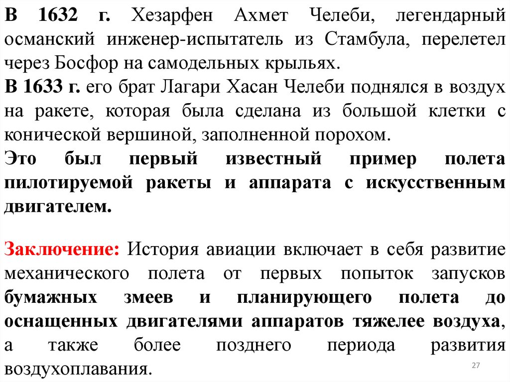 В 1632 г. Хезарфен Ахмет Челеби, легендарныйосманский инженер-испытатель из Стамбула, перелетел