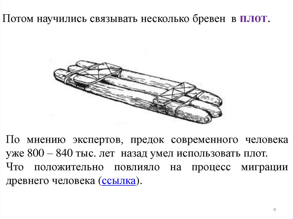 Потом научились связывать несколько бревен в плот.По мнению экспертов, предок современного человека