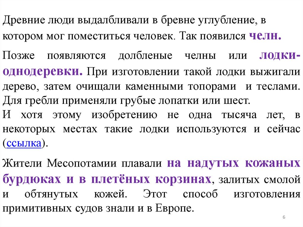 Древние люди выдалбливали в бревне углубление, вкотором мог поместиться человек. Так появился челн.