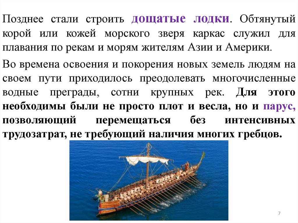 Позднее стали строить дощатые лодки. Обтянутыйкорой или кожей морского зверя каркас служил для