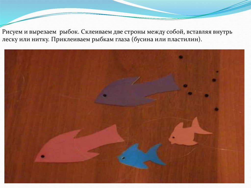 Рисуем и вырезаем рыбок. Склеиваем две строны между собой, вставляя внутрьлеску или нитку. Приклеиваем рыбкам глаза (бусина или пластилин).