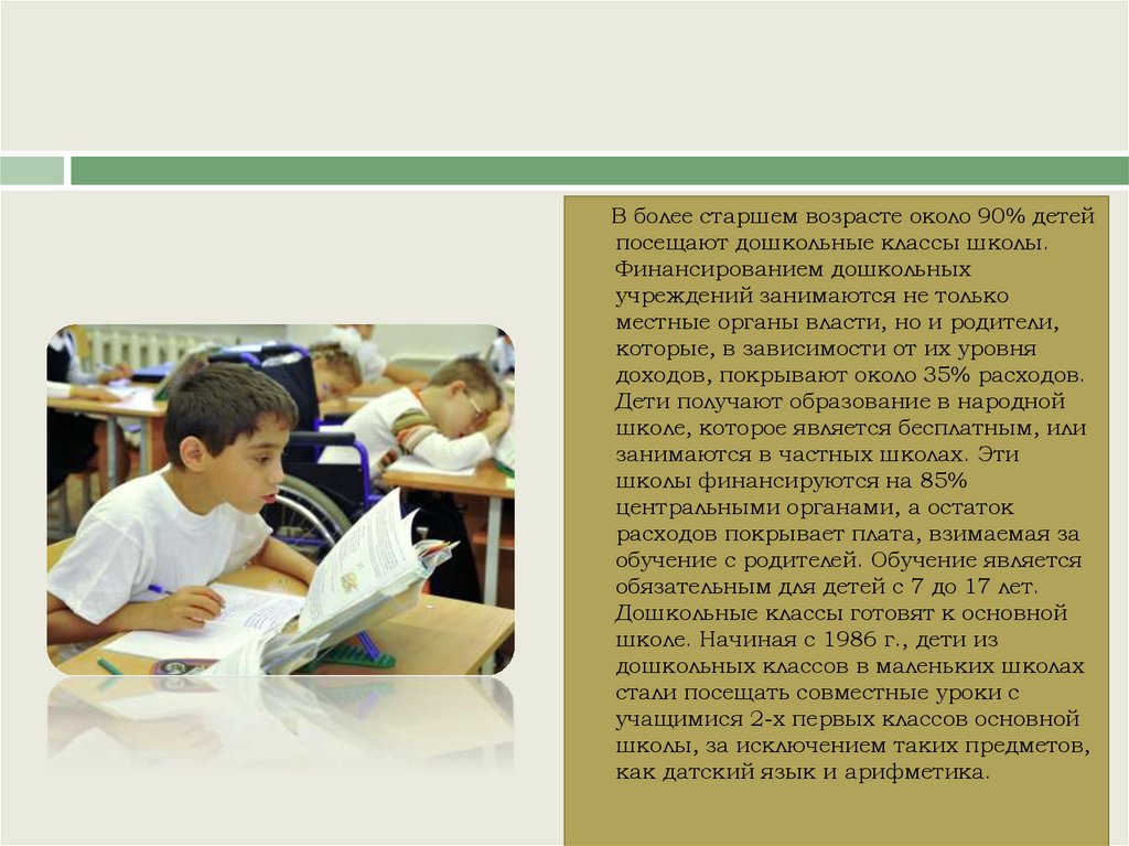 В более старшем возрасте около 90% детейпосещают дошкольные классы школы.
