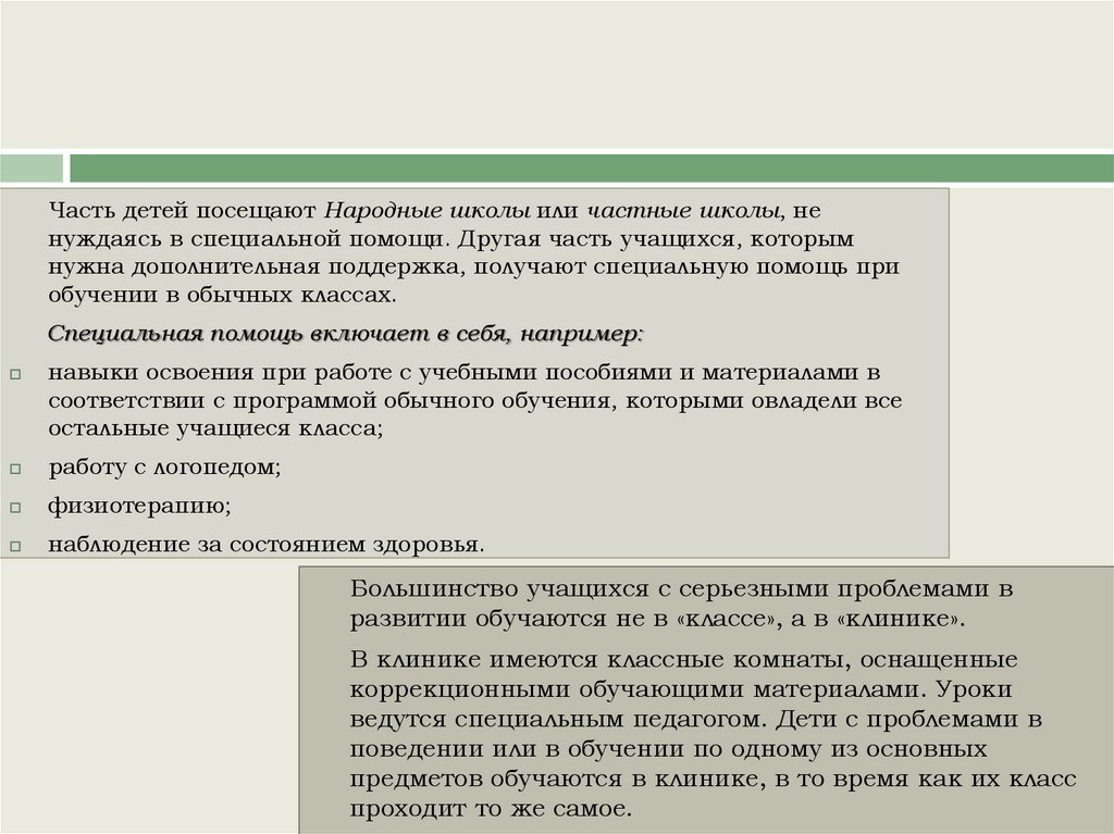 Часть детей посещают Народные школы или частные школы, ненуждаясь в специальной помощи. Другая часть учащихся, которым