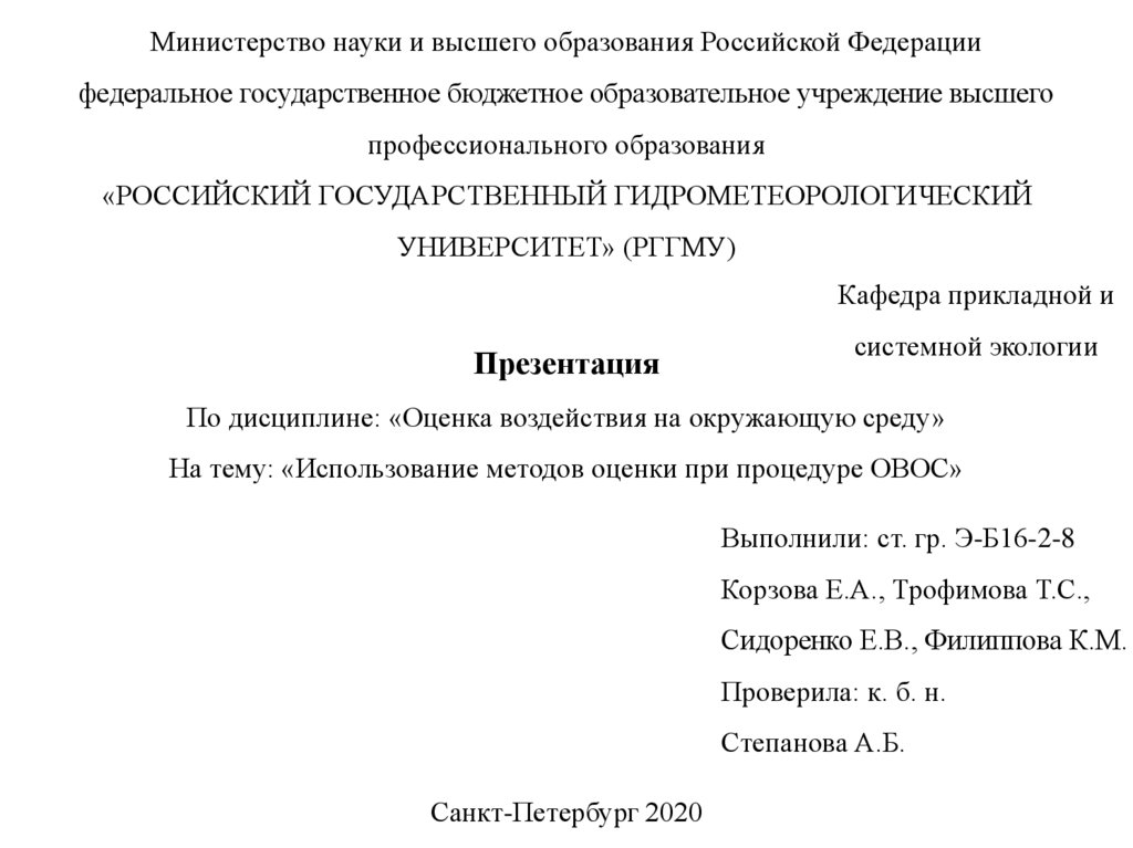 На тему: «Использование методов оценки при процедуре ОВОС»