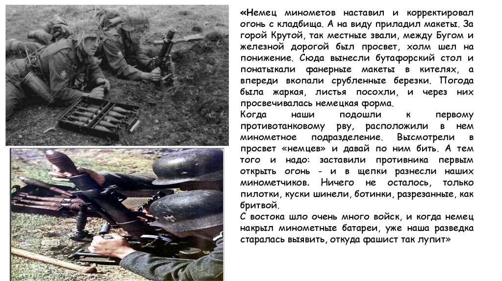 «Немец минометов наставил и корректировалогонь с кладбища. А на виду приладил макеты. За
