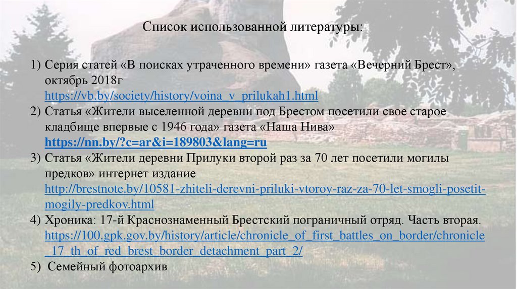 Список использованной литературы:1) Серия статей «В поисках утраченного времени» газета «Вечерний Брест»,