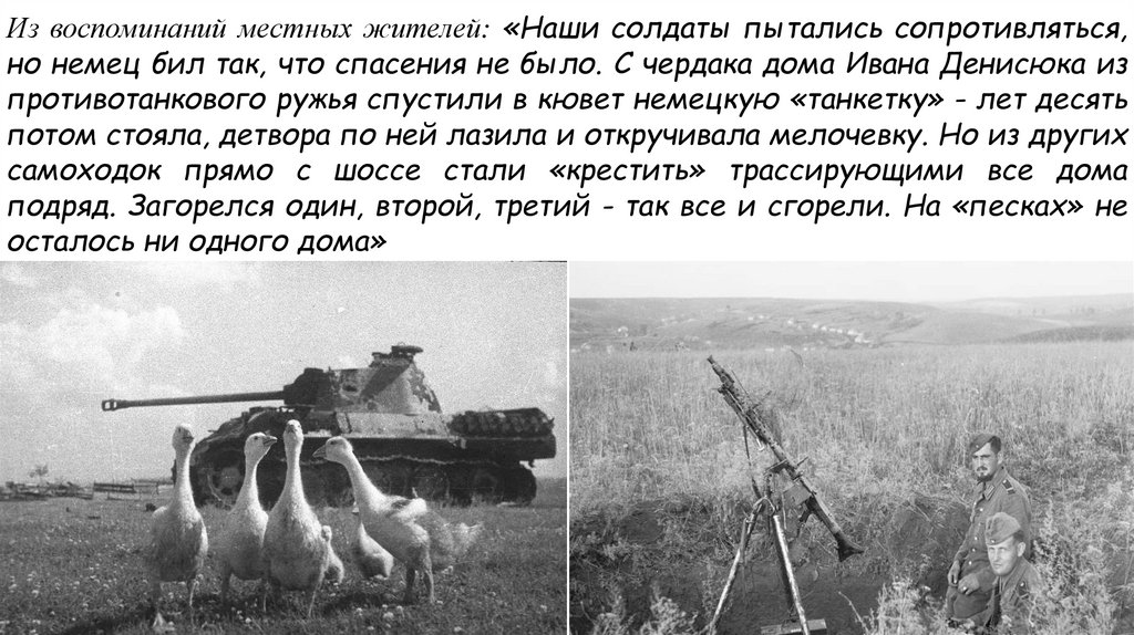 Из воспоминаний местных жителей: «Наши солдаты пытались сопротивляться,но немец бил так, что спасения не было. С чердака дома Ивана Денисюка из