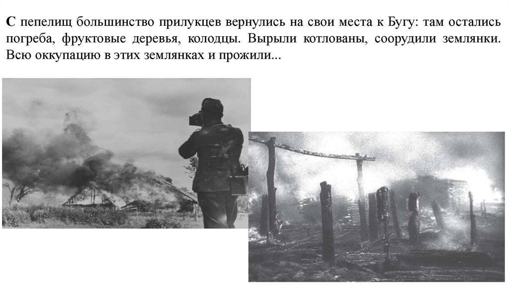 С пепелищ большинство прилукцев вернулись на свои места к Бугу: там осталисьпогреба, фруктовые деревья, колодцы. Вырыли котлованы, соорудили землянки.