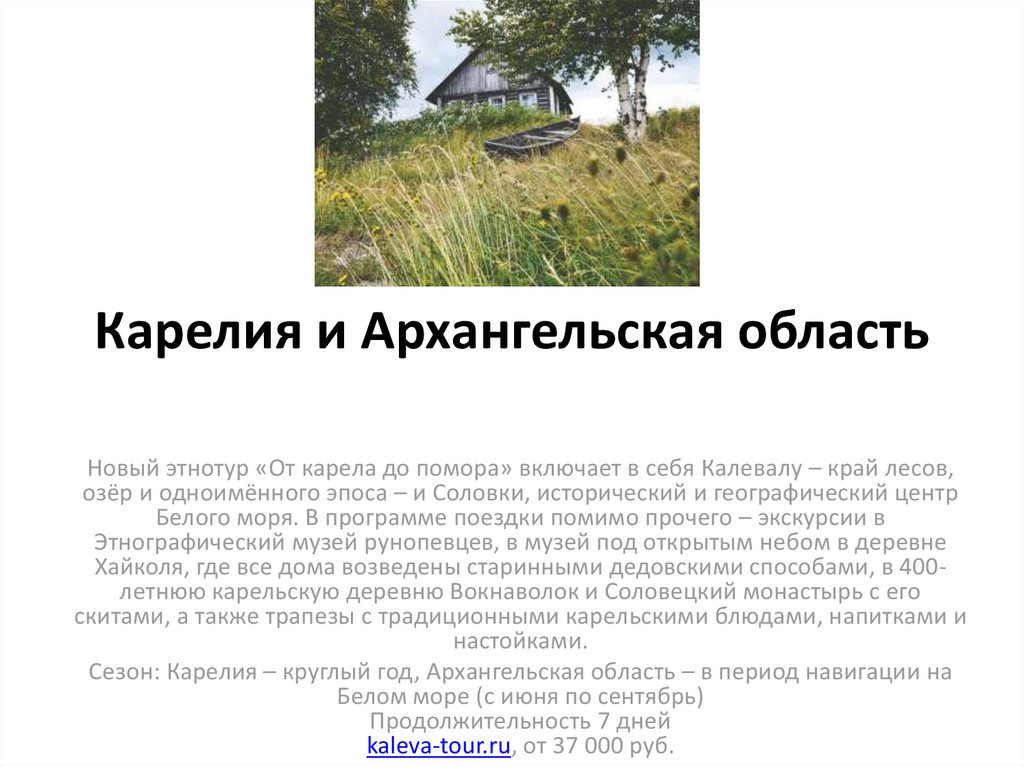 Хайколя, где все дома возведены старинными дедовскими способами, в 400летнюю карельскую деревню Вокнаволок и Соловецкий монастырь с его