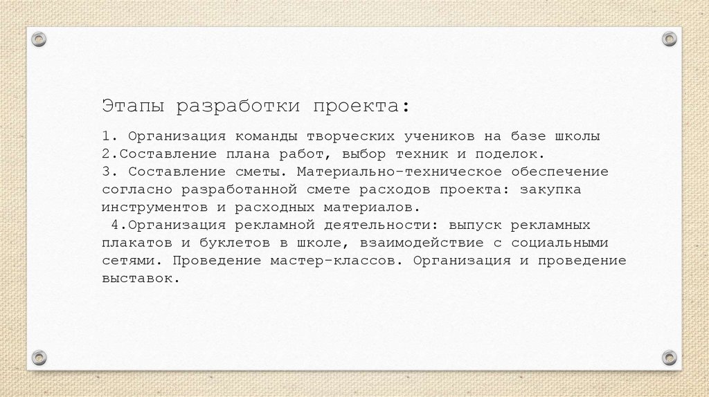 Этапы разработки проекта:1. Организация команды творческих учеников на базе школы