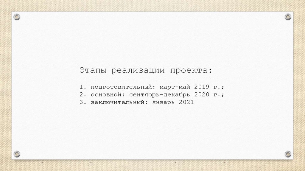 Этапы реализации проекта:1. подготовительный: март-май 2019 г.;