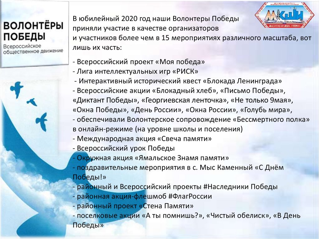 - Всероссийские акции «Блокадный хлеб», «Письмо Победы»,