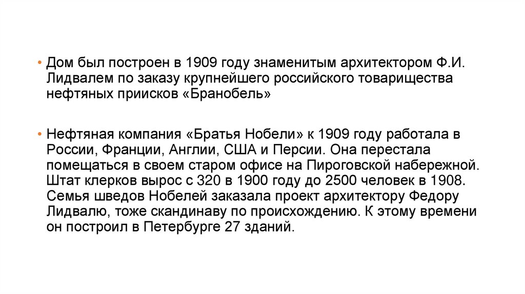 • Дом был построен в 1909 году знаменитым архитектором Ф.И.Лидвалем по заказу крупнейшего российского товарищества