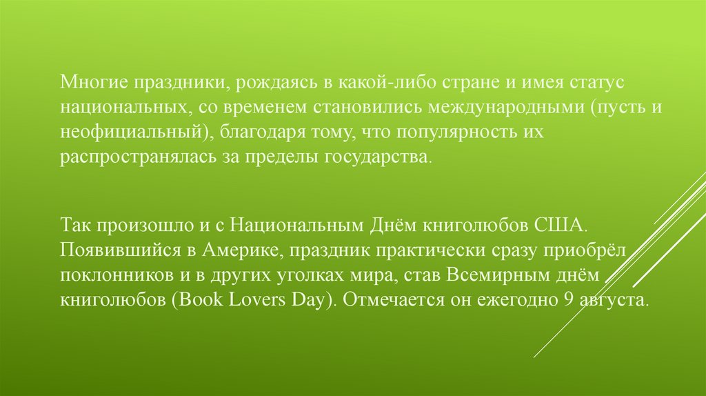 книголюбов (Book Lovers Day). Отмечается он ежегодно 9 августа.