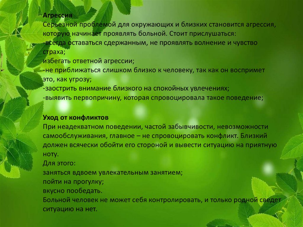 личной гигиены. Потребуется постоянноследить за тем, чтобы человек не забывал приводиться себя в порядок, чистить