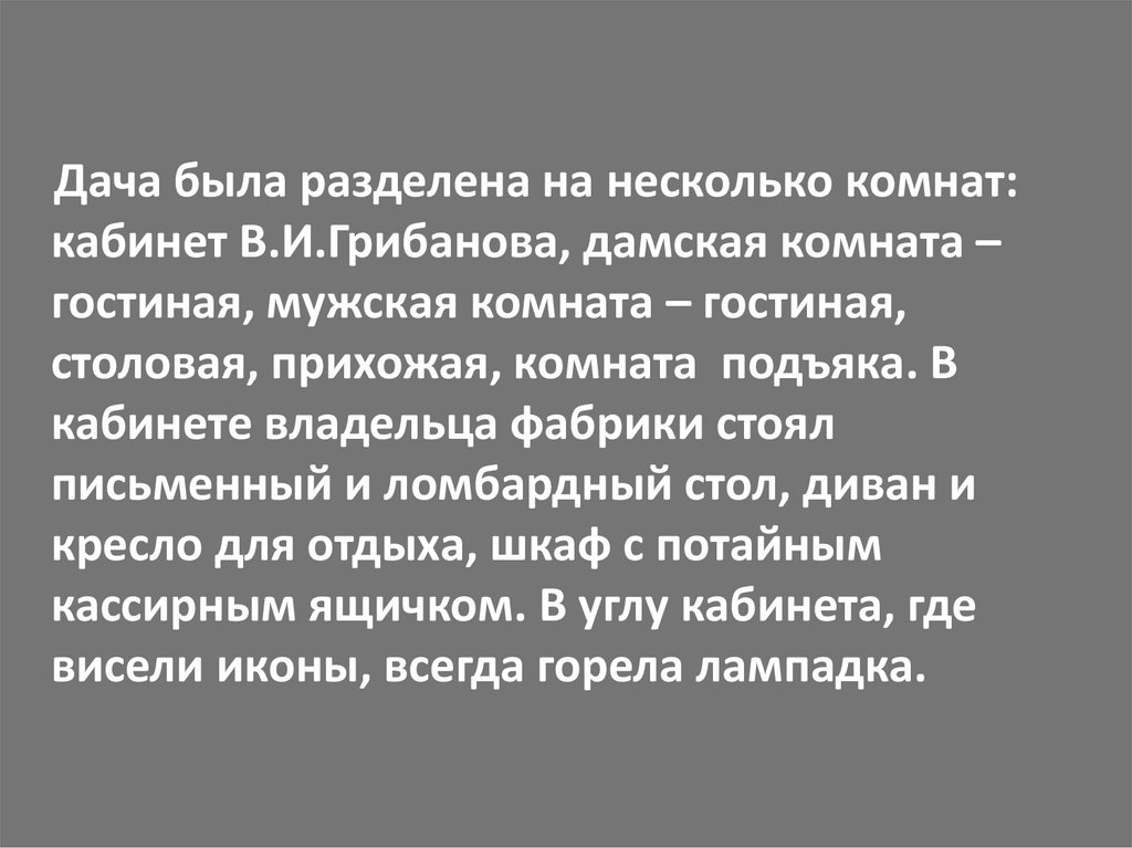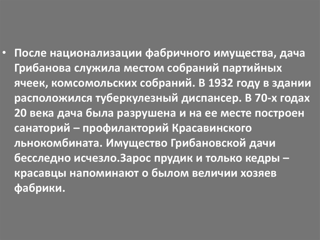 • После национализации фабричного имущества, дачаГрибанова служила местом собраний партийных