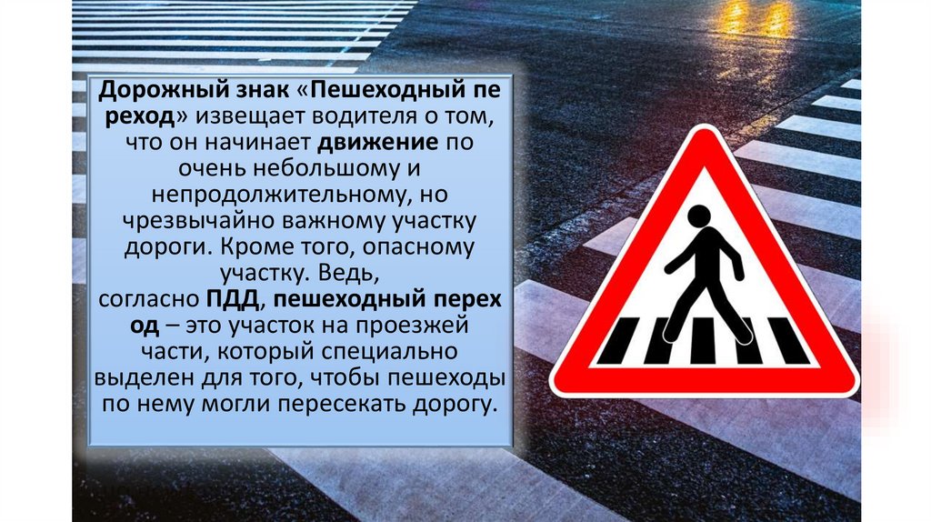 Дорожный знак «Пешеходный переход» извещает водителя о том,