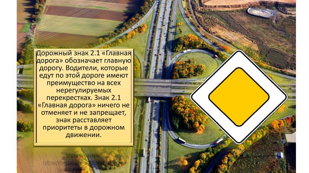 Дорожный знак 2.1 «Главнаядорога» обозначает главную