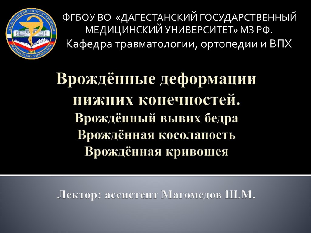 1. Врождённые деформации нижних конечностей. Врождённый вывих бедра Врождённая косолапость Врождённая кривошея Лектор: ассистент