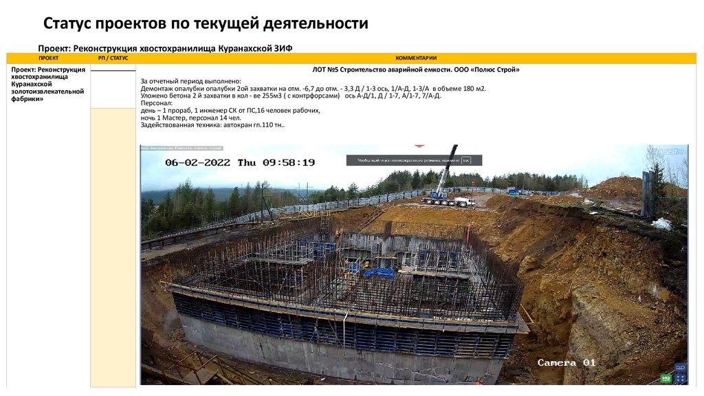Статус проектов по текущей деятельностиПроект: Реконструкция хвостохранилища Куранахской ЗИФ