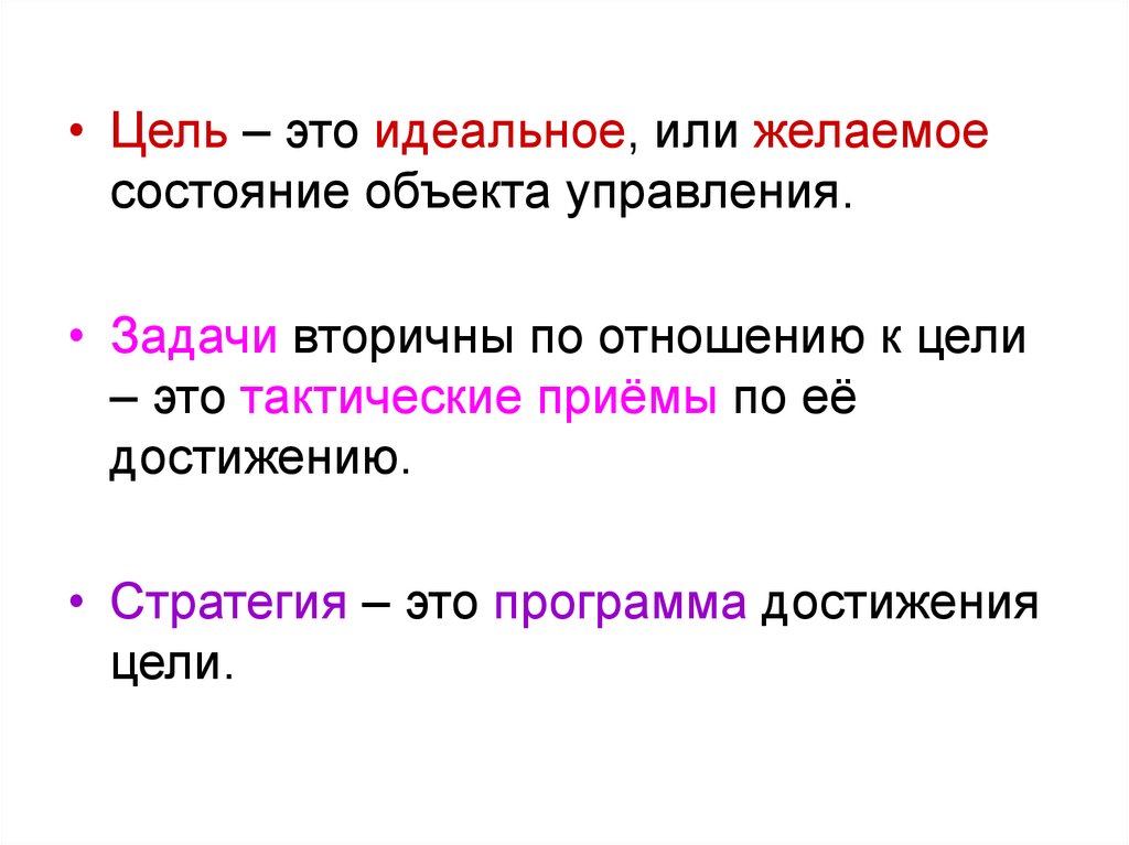 • Цель – это идеальное, или желаемоесостояние объекта управления.