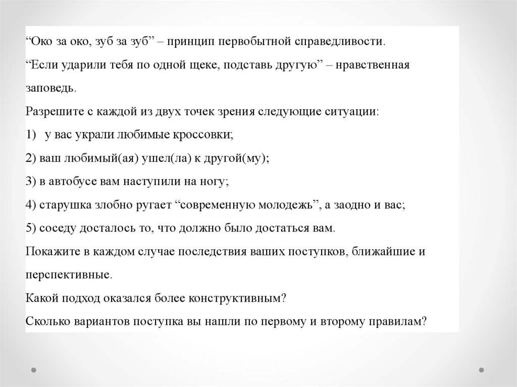 “Око за око, зуб за зуб” – принцип первобытной справедливости.“Если ударили тебя по одной щеке, подставь другую” – нравственная