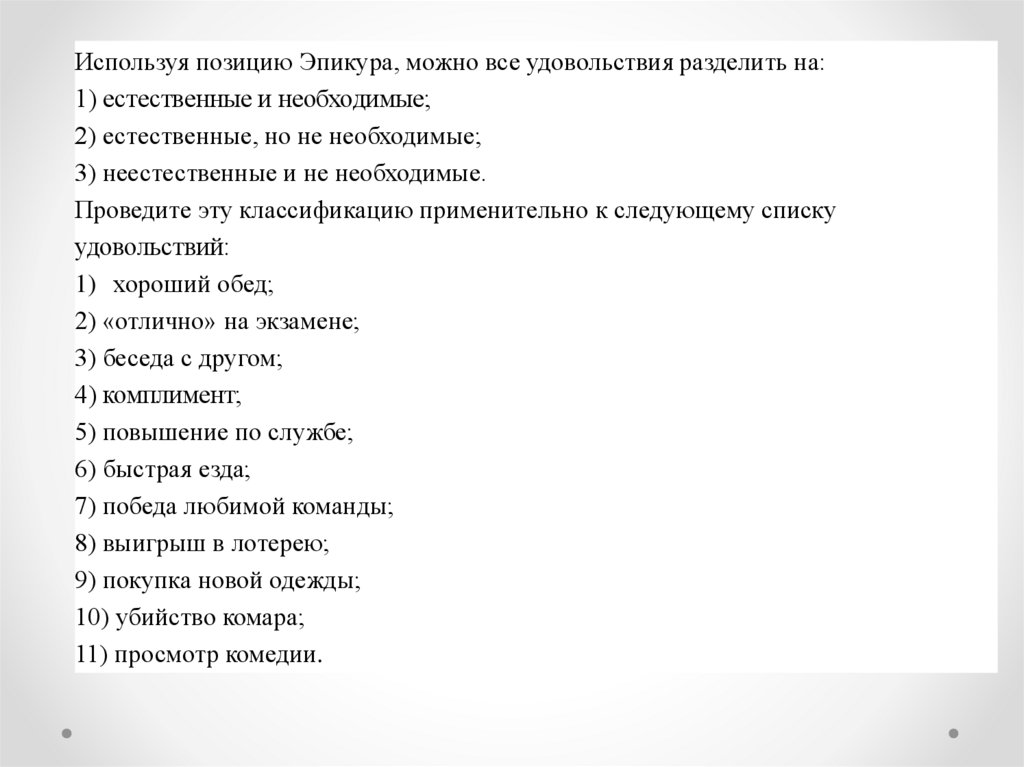 Используя позицию Эпикура, можно все удовольствия разделить на:1) естественные и необходимые;