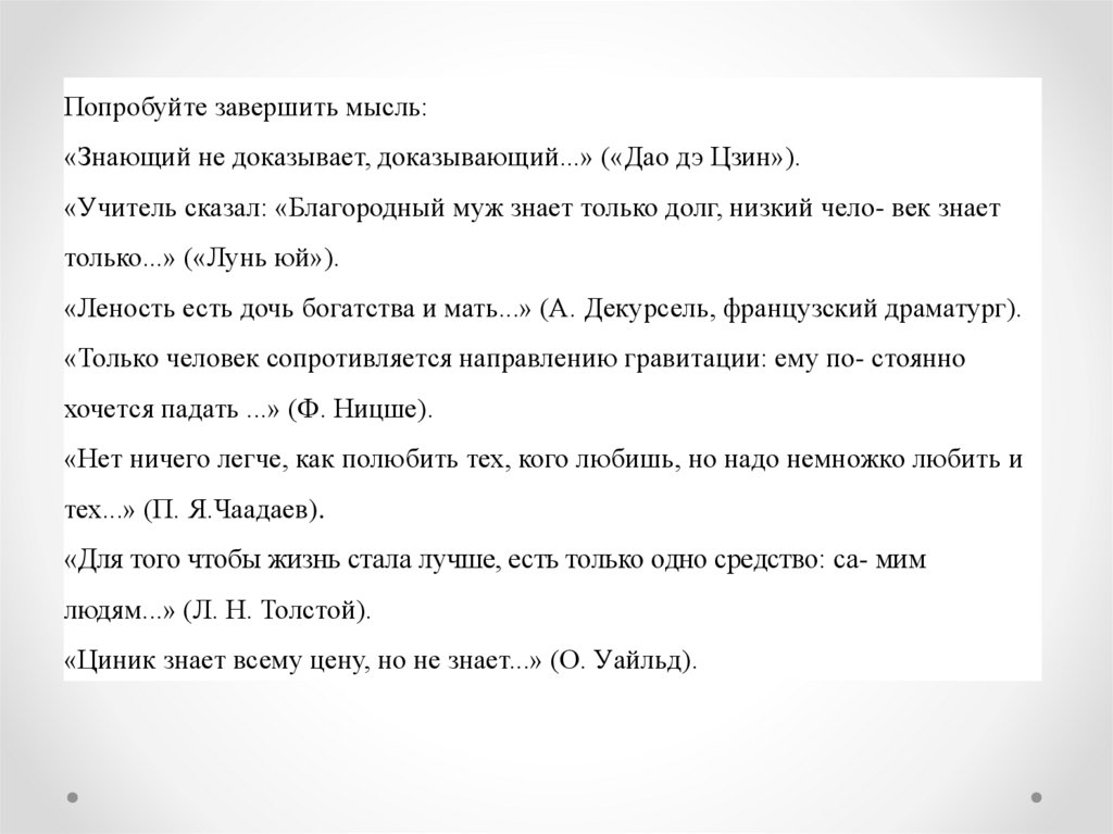 Попробуйте завершить мысль:«Знающий не доказывает, доказывающий...» («Дао дэ Цзин»).