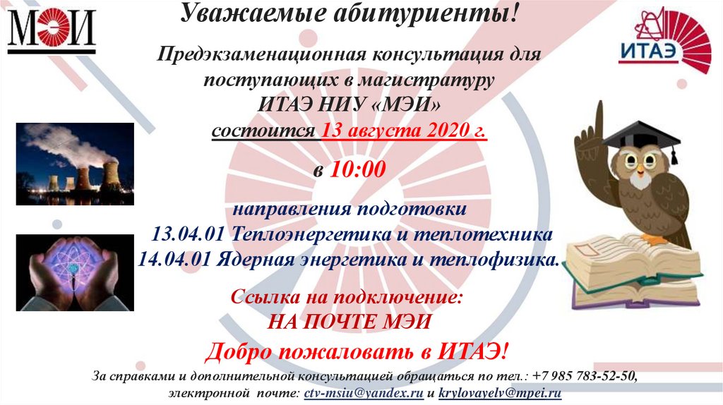 1. Уважаемые абитуриенты! Предэкзаменационная консультация для поступающих в магистратуру ИТАЭ НИУ «МЭИ» состоится 13 августа 2020