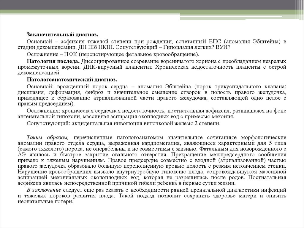 Заключительный диагноз.Основной – асфиксия тяжелой степени при рождении, сочетанный ВПС (аномалия Эбштейна) в